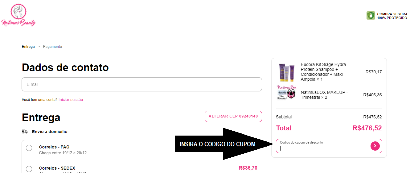 Para aproveitar um dos nossos incríveis cupons de desconto, basta digitar o seu código no campo destinado a eles na página de Finalização de compra. Insira o código de teu cupom no campo específico e depois selecione a opção comprar.